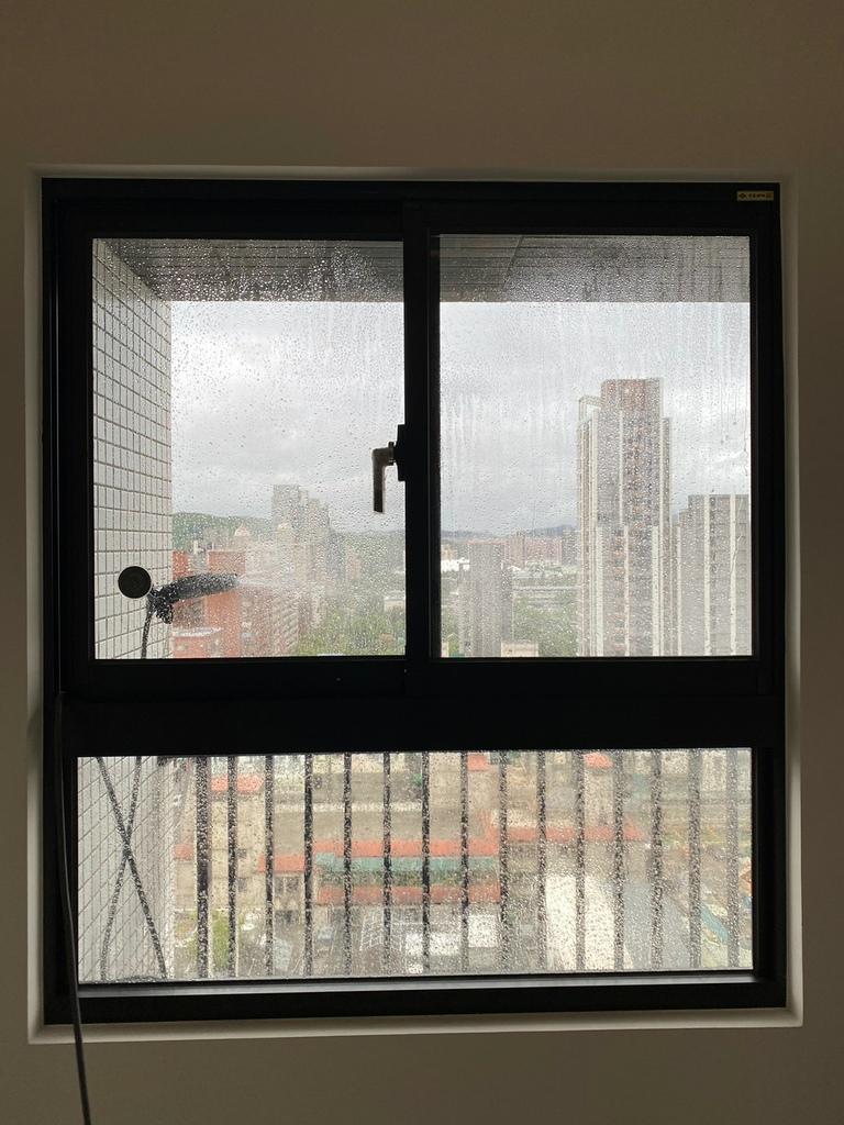 再來是窗框漏水檢查,師傅接了水管、吸附在窗戶外灑水(模擬下大雨)
